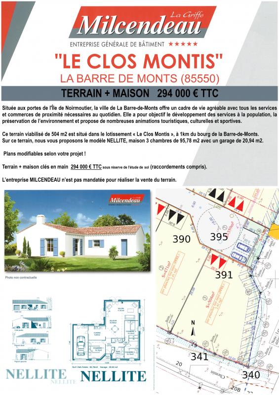 Ce terrain viabilisé de 504 m2 situé dans le lotissement "Le Clos Montis", à 1 km du bourg de la Barre de Monts. Sur ce terrain, nous vous proposons le modèle NELLITE, maison de 95.78 m2 offrant 3 chambres et un garage de 20.94 m2.