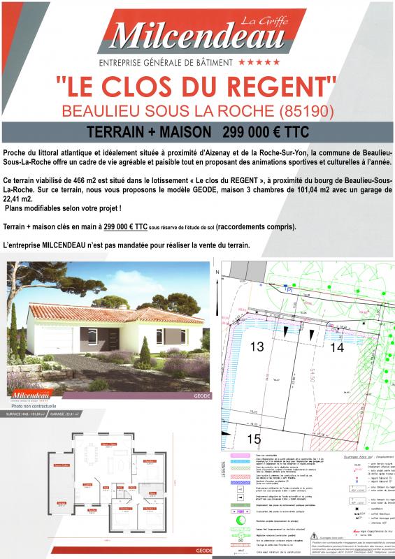 Ce terrain viabilisé de 466 m2 situé dans le lotissement "Le Clos du Régent", à proximité du bourg de Beaulieu-sous-la-Roche. Sur ce terrain, nous vous proposons le modèle GEODE, maison de 101.04 m2 offrant 3 chambres et un garage de 22.41 m2.