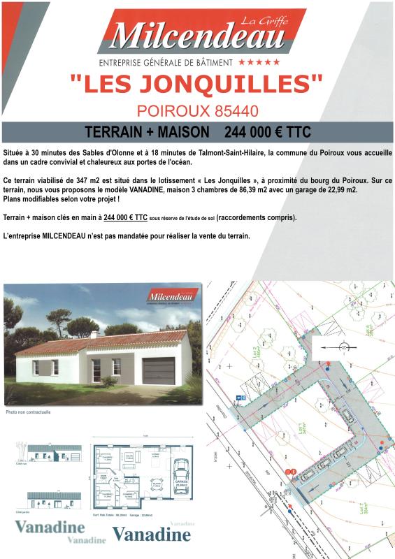 Ce terrain viabilisé de 347 m2 est situé dans le lotissement "Les Jonquilles", à proximité du bourg du Poiroux. Sur ce terrain, nous vous proposons le modèle Vanadine, maison de 86.39 m2 offrant 3 chambres et un garage de 22.99 m2.