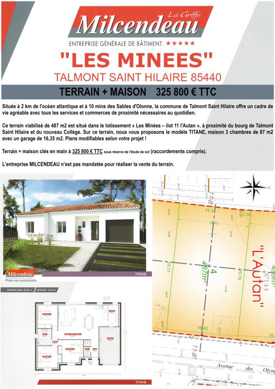 Ce terrain viabilisé de 487 m2 est situé dans le lotissement "Les Minées – Ilot 11 l’Autan", à proximité du bourg de Talmont Saint Hilaire et du nouveau collège.