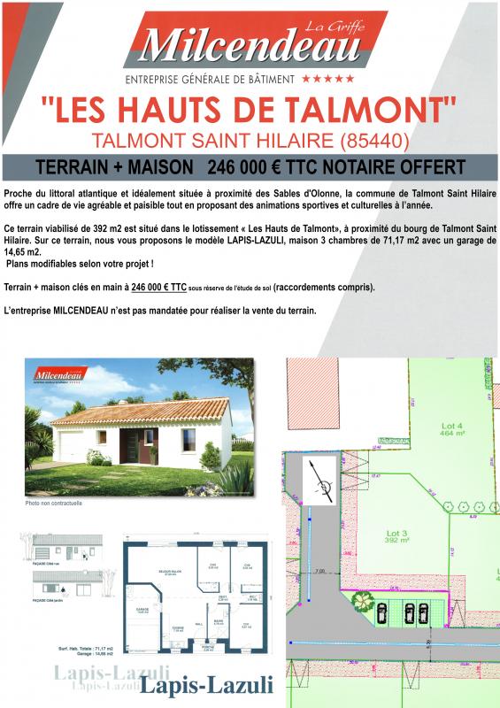Ce terrain viabilisé de 392m2 est situé dans le lotissement "Les hauts de Talmont", à proximité du bourg de Talmont Saint Hilaire. Sur ce terrain, nous vous proposons le modèle LAPIS-LAZULI, maison 3 chambres de 71.17m2 avec garage de 14.65m2. Plans modifiables selon votre projet.