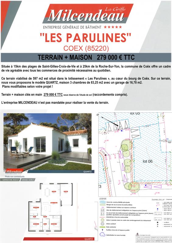 Ce terrain viabilisé de 597 m2 situé dans le lotissement "Les Parulines", au cœur du bourg de Coëx. Sur ce terrain, nous vous proposons le modèle QUARTZ, maison de 83.25 m2 offrant 3 chambres et un garage de 22.41 m2.