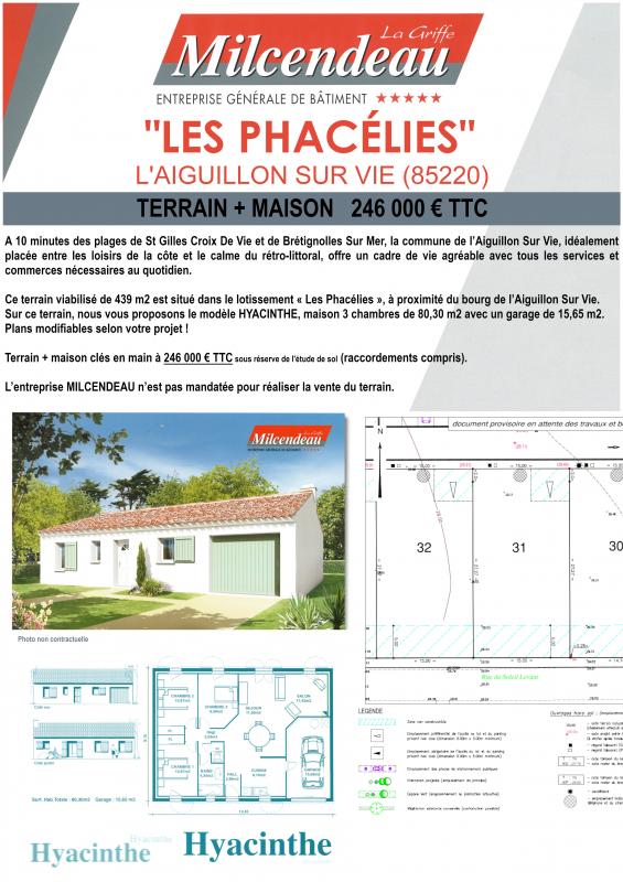 Ce terrain viabilisé de 439 m2 situé dans le lotissement "Les Phacélies", à proximité du bourg de l’Aiguillon sur vie. Sur ce terrain, nous vous proposons le modèle HYACINTHE, maison de 80.30m2 offrant 3 chambres et un garage de 15.65 m2.