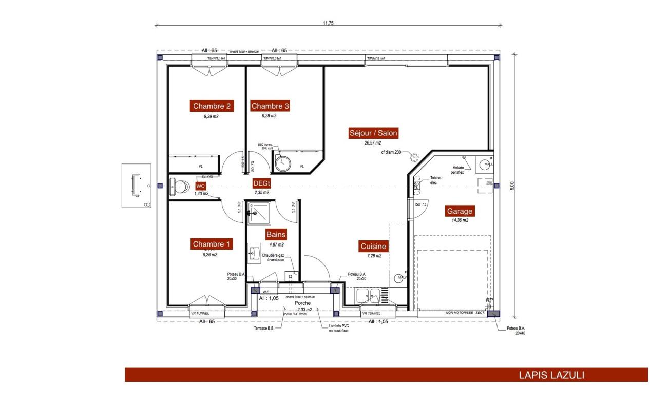 Sur ce terrain viabilisé de 432 m2, orienté sud, nous vous proposons le modèle Lapis Lazuli, maison de 71.17 m2, composée de 3 chambres avec garage de 14.65 m2.